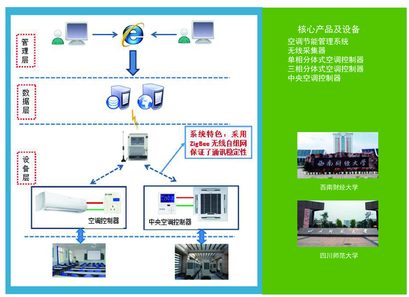 空調(diào)用電智能控制系統(tǒng)是針對空調(diào)集中管理、集中收費(fèi)、溫度控制及安全用電等方面需求研發(fā)的空調(diào)節(jié)能管控平臺。平臺支持空調(diào)用戶預(yù)付費(fèi)、自助繳費(fèi)等計(jì)量計(jì)費(fèi)功能,以及安全使用監(jiān)測、遠(yuǎn)程控制、能耗統(tǒng)計(jì)分析、溫度管理等監(jiān)控管理功能。成為客戶空調(diào)管理工作的利器。