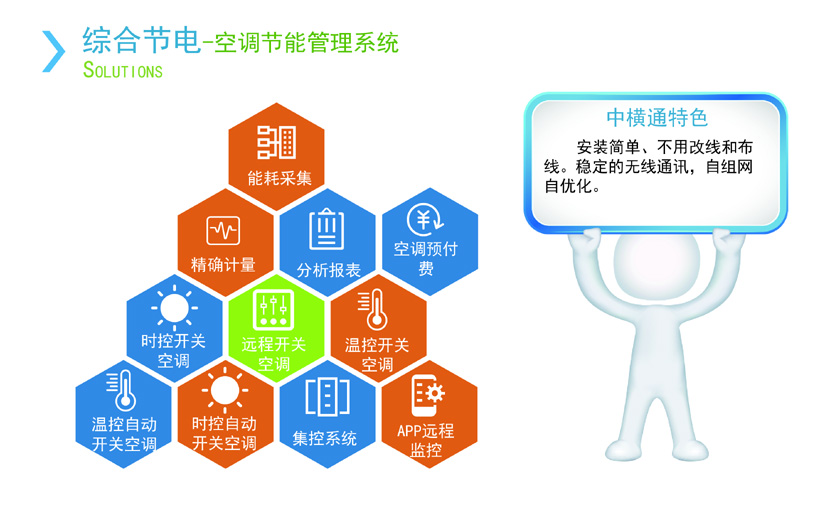 空調(diào)用電智能控制系統(tǒng)是針對空調(diào)集中管理、集中收費(fèi)、溫度控制及安全用電等方面需求研發(fā)的空調(diào)節(jié)能管控平臺。平臺支持空調(diào)用戶預(yù)付費(fèi)、自助繳費(fèi)等計(jì)量計(jì)費(fèi)功能,以及安全使用監(jiān)測、遠(yuǎn)程控制、能耗統(tǒng)計(jì)分析、溫度管理等監(jiān)控管理功能。成為客戶空調(diào)管理工作的利器。